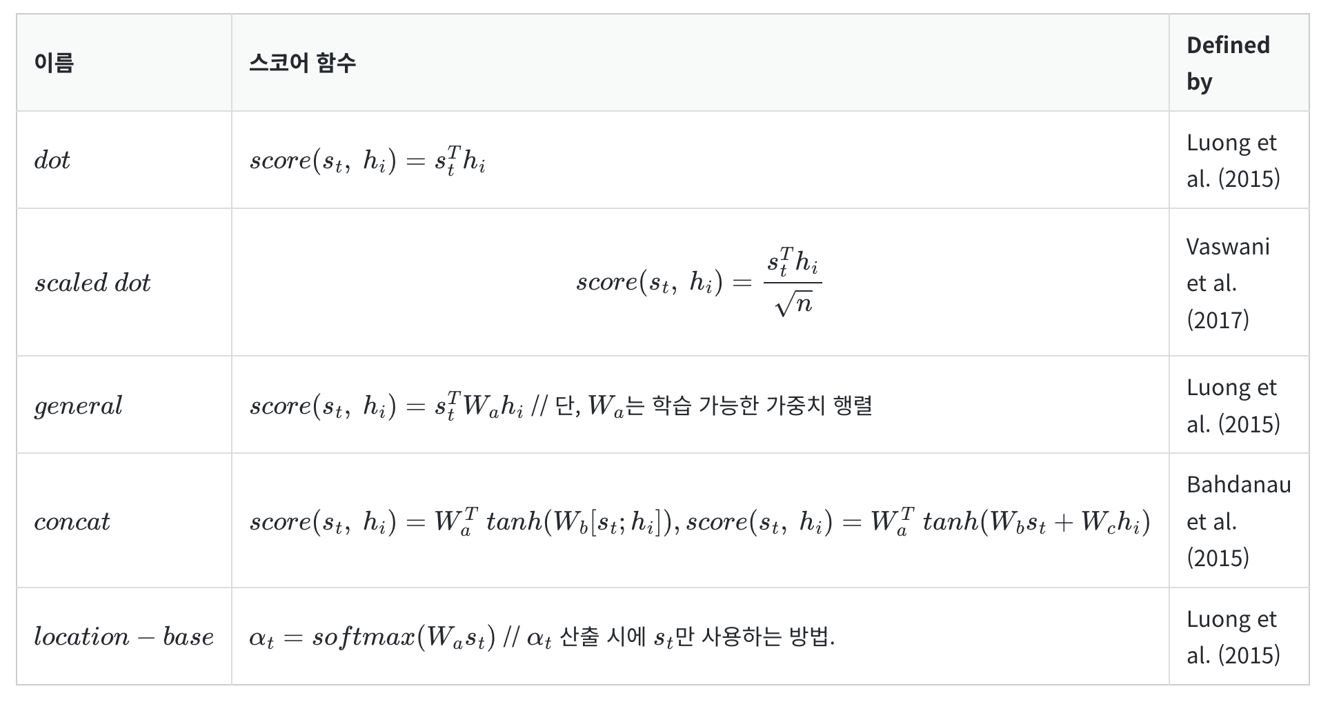 seq2seq + 어텐션 모델에 쓰일 수 있는 어텐션의 종류가 다양한데 이는 중간 수식[어텐션 스코어 함수]의 차이로 나눠진다.