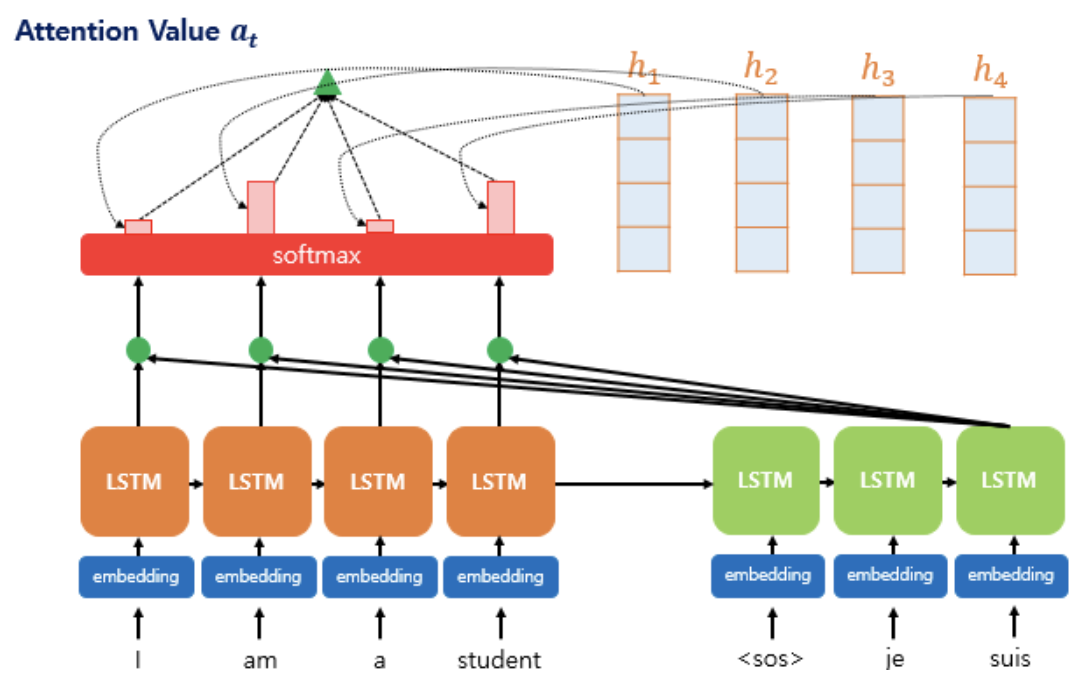 디코더의 세번째 LSTM 셀은 출력 단어를 예측하기 위해서 인코더의 모든 입력 단어들의 정보를 다시 한 번 참고한다. 이 때 주목해야 하는 부분은 인코더의 소프트맥스 함수이다. 소프트맥스 함수를 통해 나온 값은 I, am, a, student 단어 각각이 출력 단어를 예측할 때 얼마나 도움이 되는지의 정도를 수치화한 값이다. [위의 그림에서는 빨간 히스토그램의 크기로 소프트맥스 함수의 결과값의 크기를 표현했다. 그 크기가 클수록 도움이 되는 정도의 크기가 크다.] 각 입력 단어가 디코더의 예측에 도움이 되는 정도가 수치화하여 측정되면 이를 하나의 정보로 담아서 디코더로 전송된다. [위의 그림에서는 초록색 삼각형이 이에 해당된다.] 즉, 디코더가 새로운 단어를 예측하는데 있어서 Recurrent하게 전달된 정보 외에도 input sequence의 정보를 참고할 수 있게 된다.