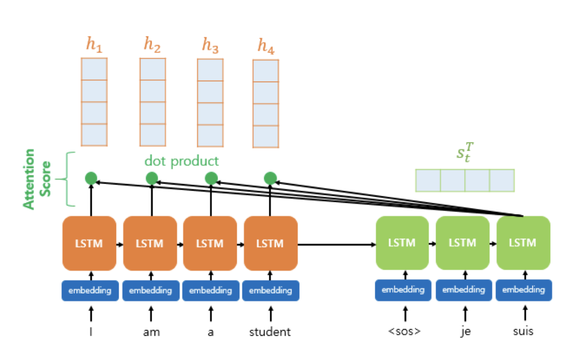 $score(s_t, h_i) = s^T_th_i$ -> 이 때 결과 값은 scalar가 된다.