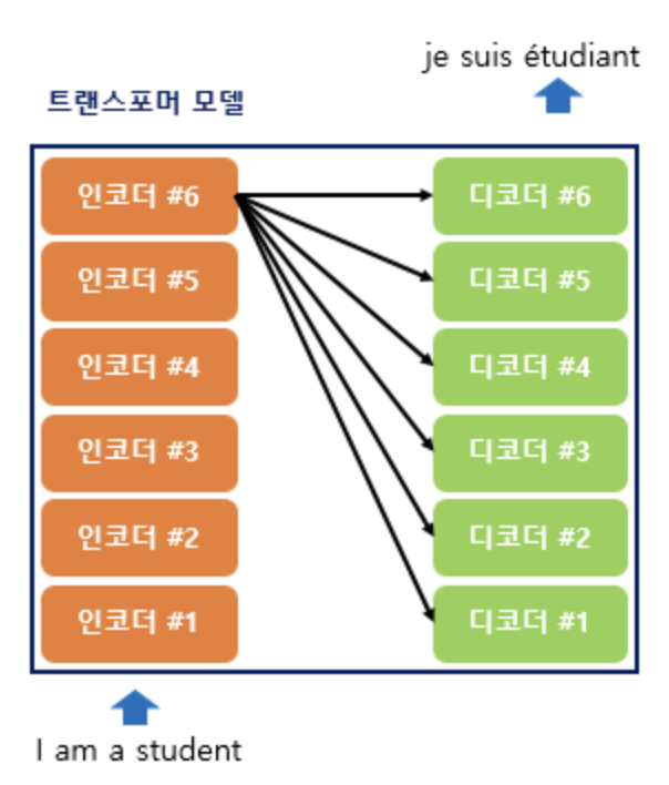 트랜스포머를 제안한 논문에서는 인코더와 디코더의 개수를 각각 6개 사용했다. 위의 그림이 인코더와 디코더 각 6개씩 존재하는 트랜스포머의 구조를 보여준다.