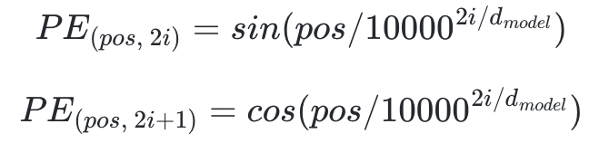 $pos$ 는 입력 문장에서의 임베딩 벡터의 위치를 나타내며, $i$ 는 임베딩 벡터 내의 차원의 인덱스를 의미한다. 임베딩 벡터 내의 각 차원의 인덱스가 짝수[$pos, 2i$]인 경우에는 사인 함수의 값을 사용하고, 홀수[$pos, 2i+1$]인 경우에는 코사인 함수의 값을 사용한다. 또, $d_{model}$ 은 트랜스포머의 모든 층의 출력 차원을 의미하는 트랜스포머의 하이퍼파라미터 이다.