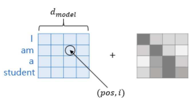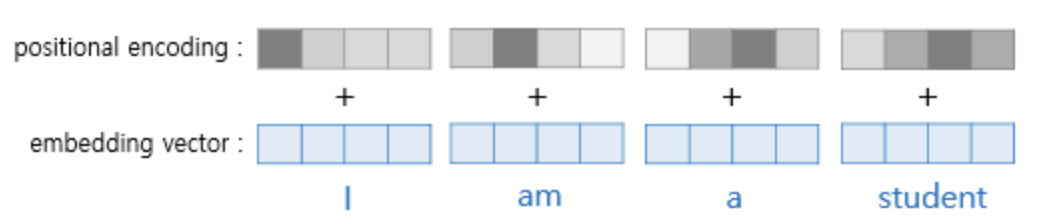 트랜스포머는 단어의 위치 정보를 얻기 위해 각 단어의 임베딩 벡터 위치 정보들을 더하여 모델의 입력으로 사용하는데, 이를 포지셔널 인코딩이라고 한다.