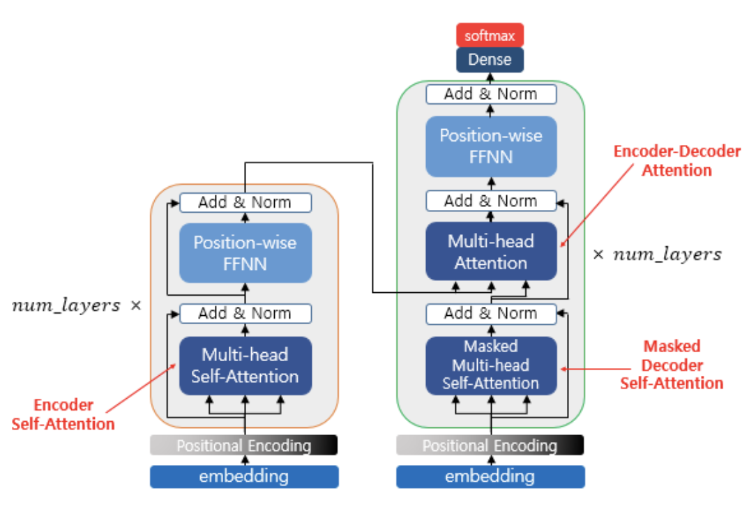 Encoder Self-Attention 은 Attention이 인코더에서 이루어지지만, Masked Decoder Self-Attention 과 Encoder-Decoder Attention은 디코더에서 이루어진다. Self-Attention 은 Query, Key, Value 가 동일한 경우를 말한다. Encoder-Decoder Attention 에서는 Query가 디코더의 벡터인 반면 Key와 Value가 인코더의 벡터이므로 셀프 어텐션이라고 하지 않는다.