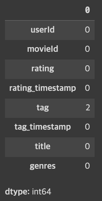 3. timestamp_x, timestamp_y 변수명을 각각 rating_timestamp, tag_timestamp 로 변경해주고, Nan 값의 유무를 확인해주었다.