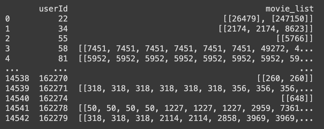 final_grouped_result = exploded_result.groupby('userId').apply(lambda x: x['movieId'].to_list()).reset_index(name='movie_list')