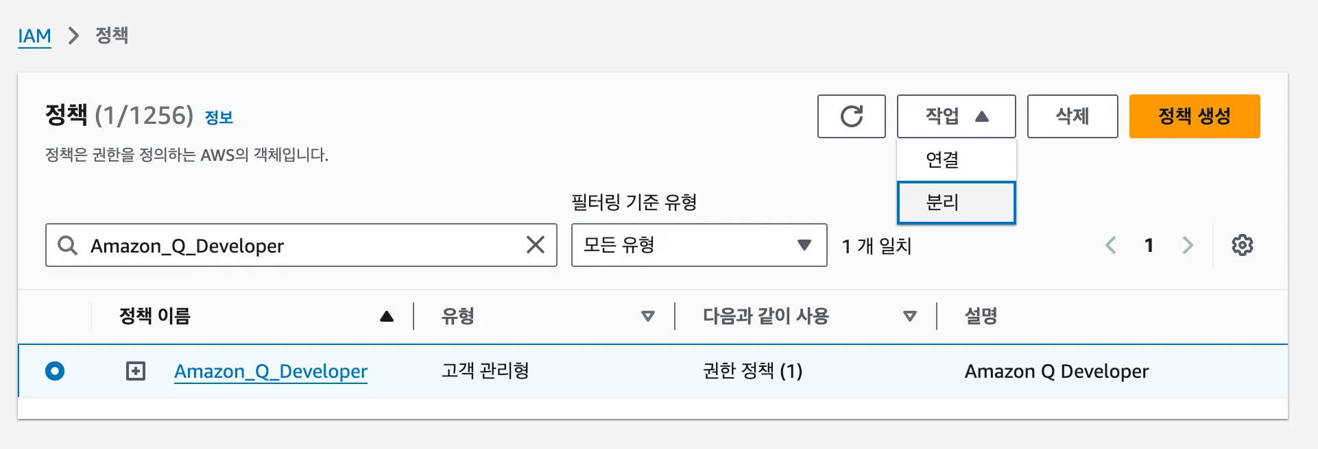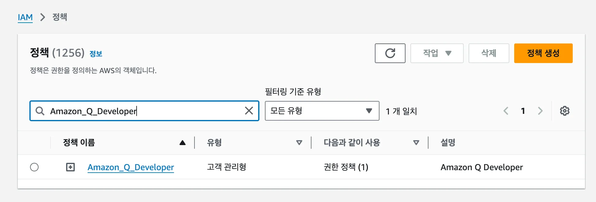 - IAM > 정책 페이지에서 확인하면 해당 정책이 제대로 생성되어 있는 것을 볼 수 있다.