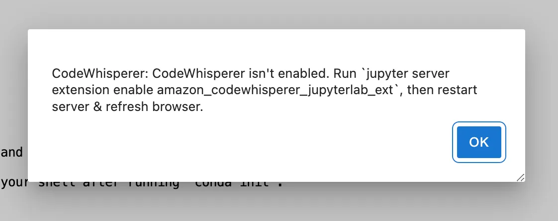 - 원래 아래와 같이 지정하라고 해서 아래도 지정했었는데 이렇게 해주니까 실제 쥬피터에서 Code Whisperer가 실행되지 않았다.